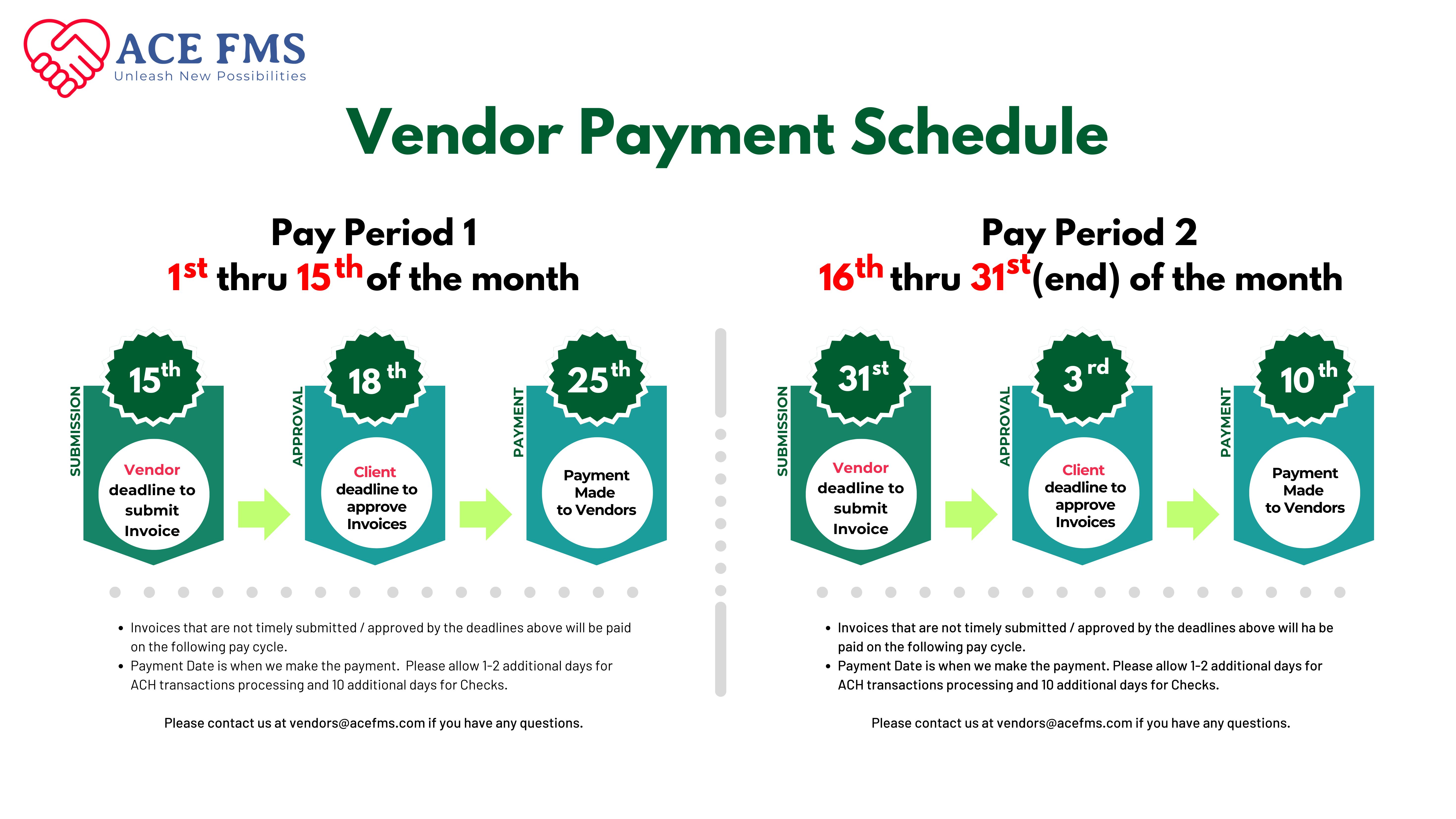 Invoices submitted by the 15th of the month and approved by the client by the 18th should be paid out on the 25th of the month.