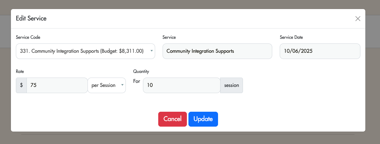Notes: Only the service codes which this vendor has been approved for on the current spending plan will be available to select. Repeat steps 4 and 5 as needed if billing for multiple items that are different rates or fall under different service codes.