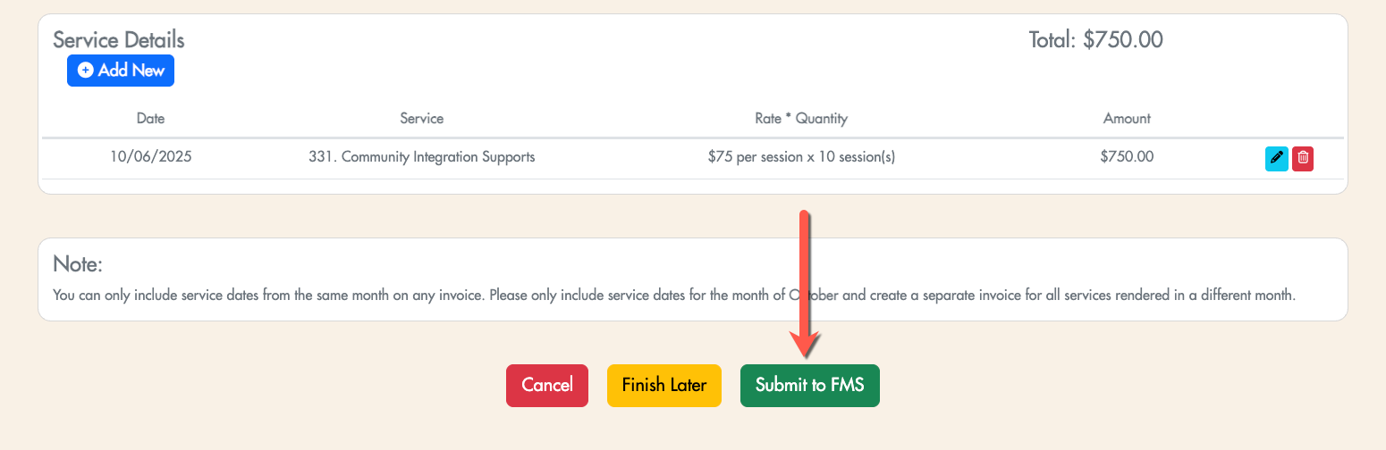 6. Now that you have added the invoice details, you are able to submit the invoice. Click on the "Submit to FMS" button to do so.