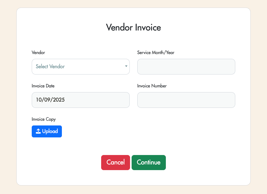 3. Select Vendor, select the month and year in which the service took place, input Invoice Date and Invoice Number and upload the invoice document. Then click on the "Continue" button.